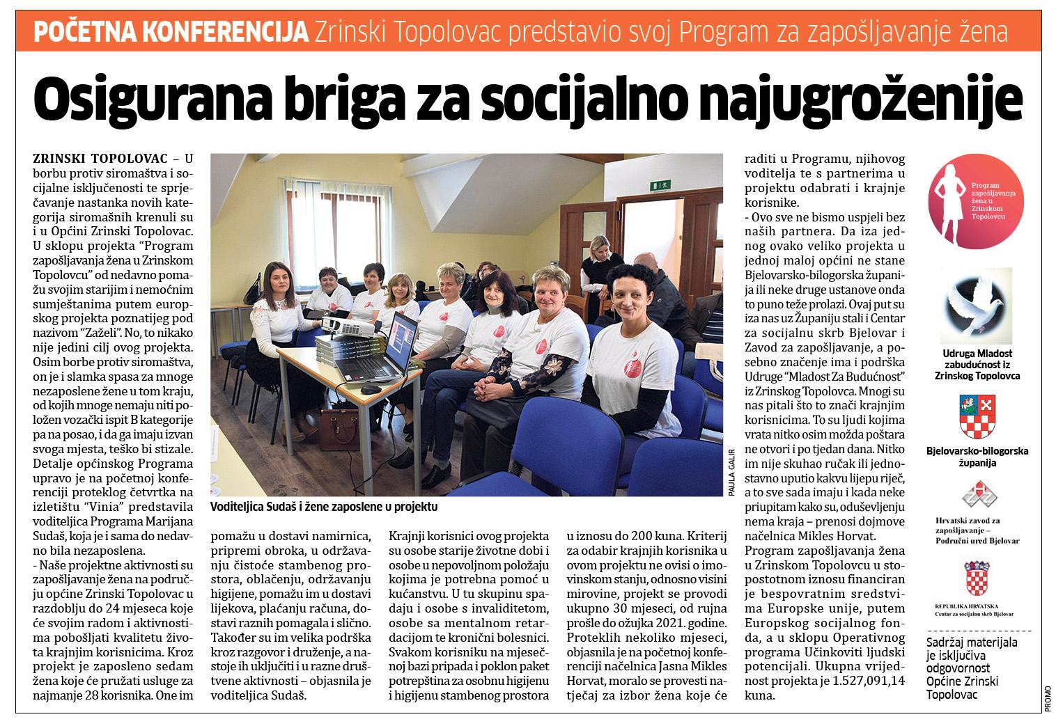 „Program zapošljavanja žena u Zrinskom Topolovcu“ je projekt iz Europskog socijalnog fonda koji je među prvima u Hrvatskoj prepoznala načelnica Općine Zrinski Topolovac JASNA MIKLES HORVAT, te ga odlučila hrabro provesti na području Općine Zrinski Topolovac i time zaposliti žene i osigurati im prihod, a starijima, bolesnima i nemoćnima poboljšati kvalitetu života i socijalnu uključenost.